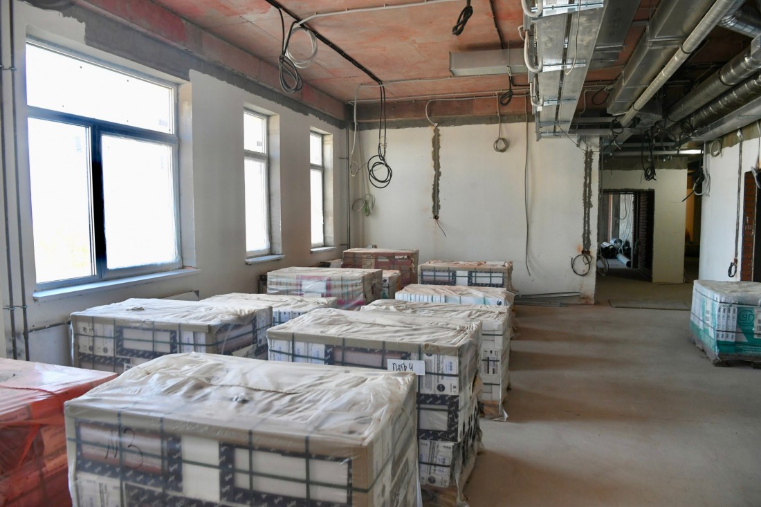 Специалисты уже завершают черновые отделочные работы и переходят к укладке напольной и настенной плиток, проводят электрические сети, устанавливают системы водоснабжения и водоотведения, монтируют вентиляцию, на крыше построена вертолетная площадка, которая расширит возможность приема пациентов из отдаленных районов Карелии в короткие сроки с использованием санавиации. Сегодня на объекте задействовано 100 работников.