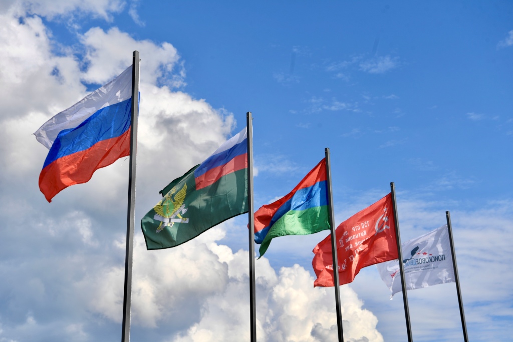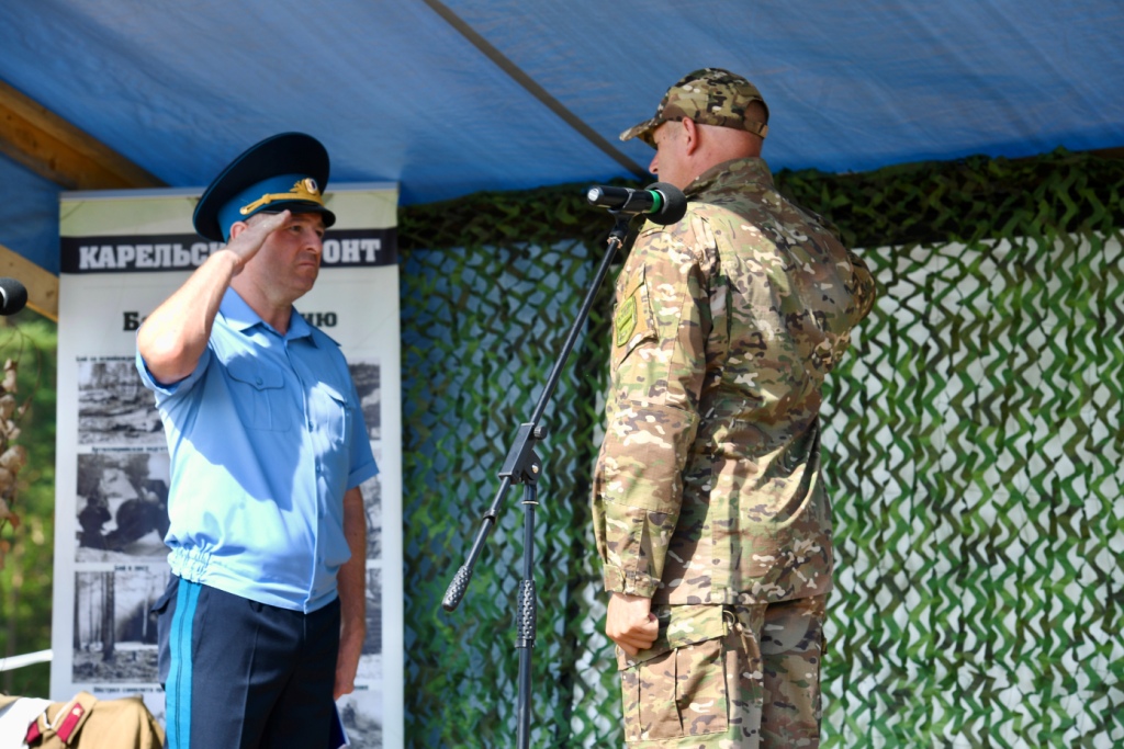В память о героях Карельского фронта под звуки гимна России ветеран и почетные участники поискового движения ФССП России – сотрудники службы судебных приставов из Москвы, Татарстана, Карелии, Луганской Народной Республики, Твери подняли флаги Российской Федерации, Карелии и Федеральной службы судебных приставов. Также в небо взвились Знамя Победы и флаг поискового движения России.
