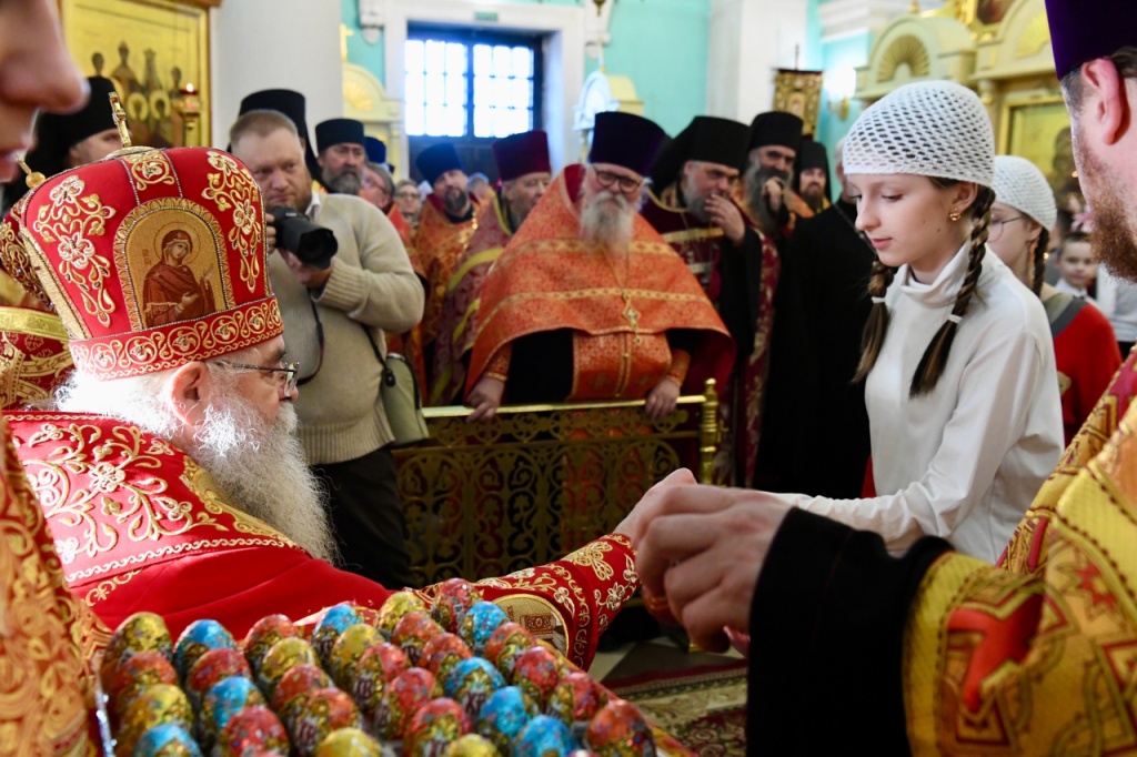 В начале богослужения Владыка внес в собор Благодатный огонь, который прибыл в Карелию из Иерусалима. Воспитанники воскресной школы при соборе поздравили митрополита Константина с Пасхой стихами и песнопениями. Митрополит вручил детям подарки, поздравил верующих со Светлым Праздником Пасхи, призвал всех делиться пасхальной радостью друг с другом.